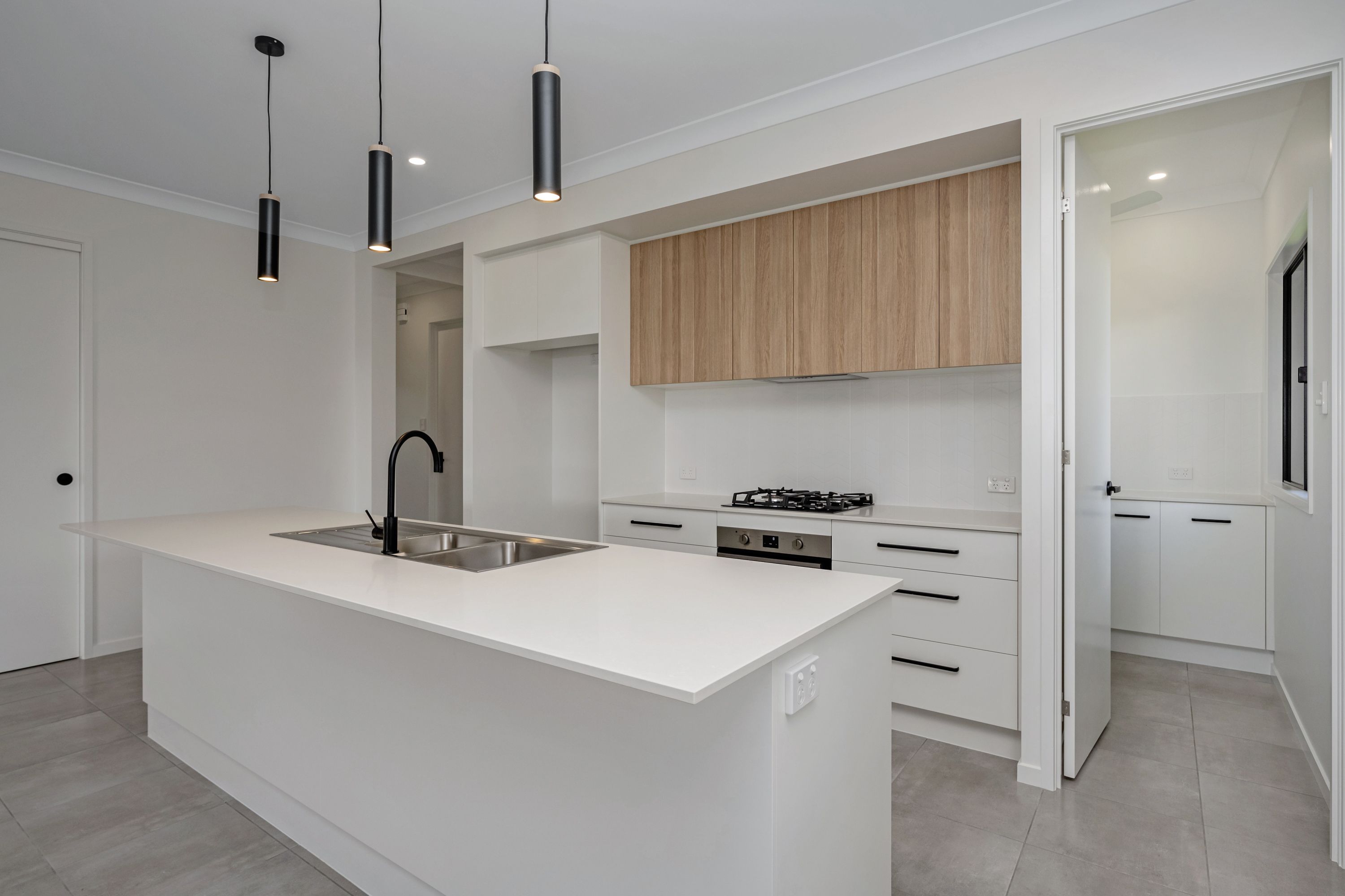 At the heart of the home is a spacious kitchen with stone benchtops, soft-close cabinetry, quality appliances, a 60cm gas cooktop, built-in microwave, and a walk-in pantry, seamlessly flowing into the open-plan living and dining areas.