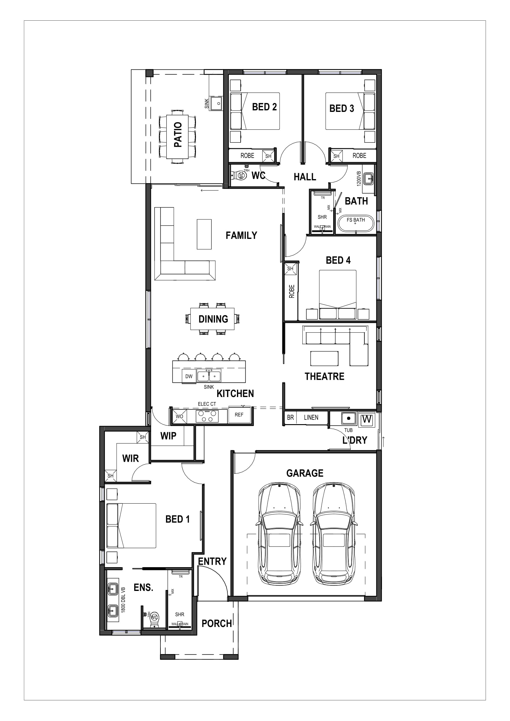 The layout features four well-proportioned bedrooms, including a private master suite with walk-in robe and ensuite, two stylish bathrooms, and a separate theatre room-perfect for family movie nights or quiet retreat. The main bathroom is highlighted by a large freestanding bathtub, adding a touch of luxury.